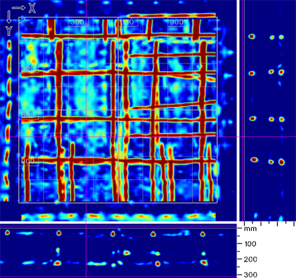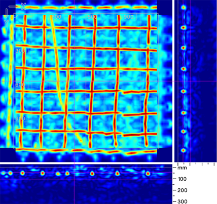 Piilossa olevien kohteiden rikkomaton tarkastus ja tunnistus teräs-lujitetussa ja jännitetyssä betonissa, kuten lattioissa, kansissa, laatoissa, tunneleissa, siiloissa ja rakennuksissa.